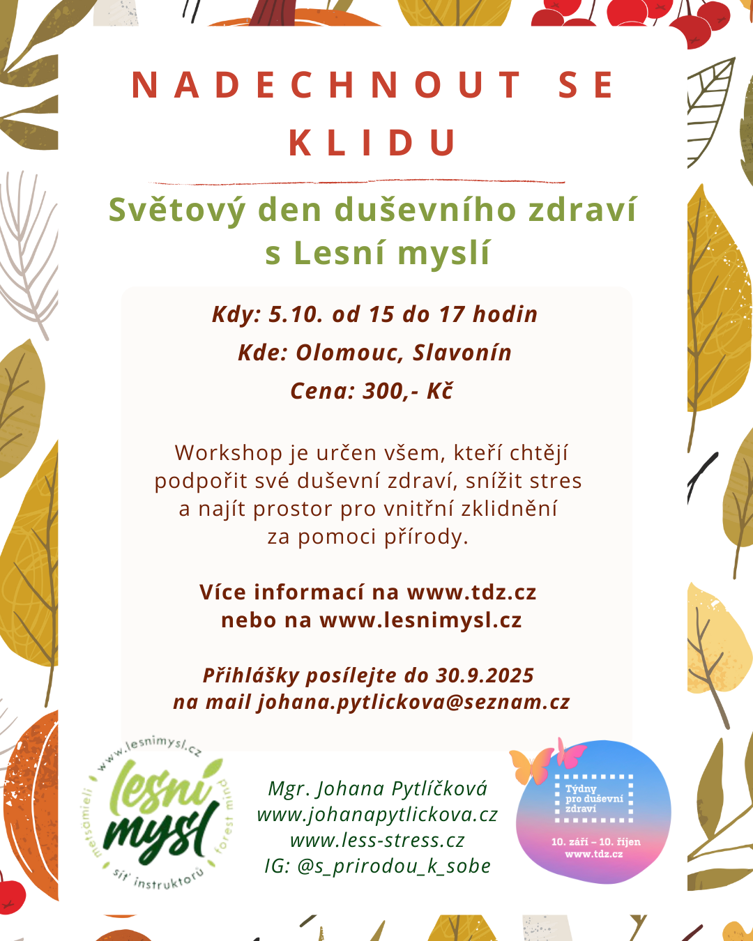 Žijeme v hektické době, kdy jsme často ve stresu, přesyceni podněty, informacemi, úkoly a zapomínáme či nestíháme pečovat o svoje duševní zdraví. Přitom péče o duševní zdraví je stejně důležitá jako péče o fyzické zdraví. A prevence hraje zásadní roli. Dopřejte si čas pro sebe a přijďte na workshop Nadechnout se klidu ~ Světový den duševního zdraví s Lesní myslí, na kterém budete mít prostor zastavit se a dočerpat energii z přírody a tím podpořit svoje duševní zdraví a pohodu. Na workshopu se např. naučíte, jak můžete využívat přírodu jako pomocnici pro uvolnění napětí a snížení stresu.