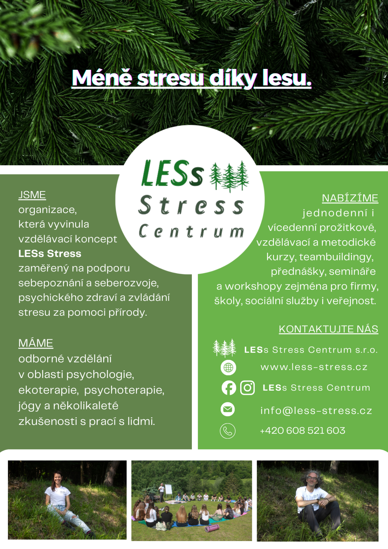 S kolegou Lukášem Szlaurem, psychologem a terapeutem, jsme vytvořili vzdělávací koncept LESs Stress a v návaznosti na něj jsme založili společnost LESs Stress Centrum. Veškeré informace, kalendář akcí i přihlašovací formulář naleznete na webových stránkách LESs Stress.